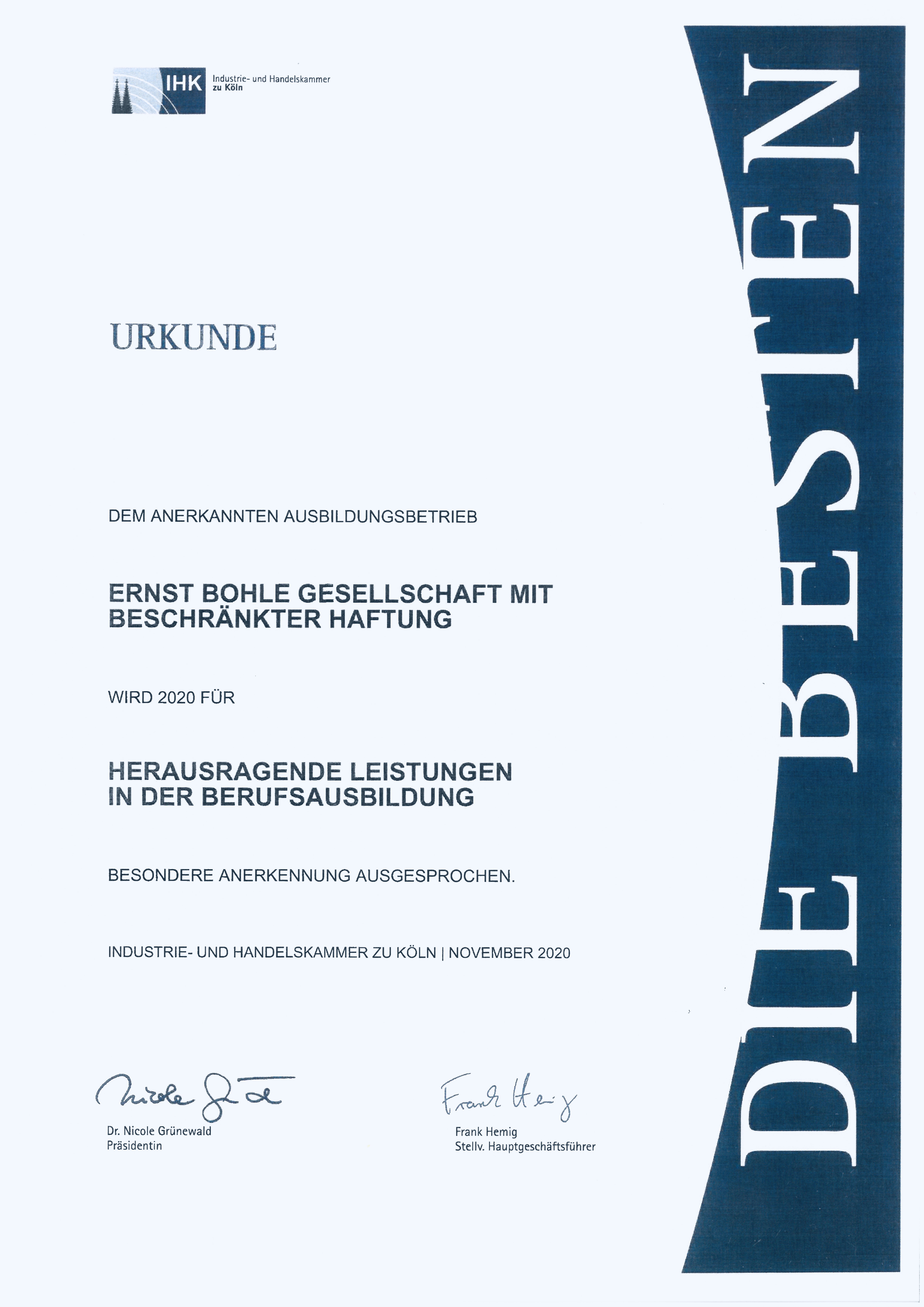 We are pleased to receive "The Best Certificate" ("Die Besten-Urkunde") from the IHK in recognition of special achievements in vocational training.